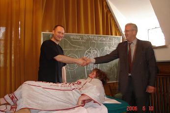 Zobacz migawki z wykładu mistrza bioenergoterapii Tomasza Kruka (10.06.2006r.) „.....pierwsze doznanie medialne w zamku francuskim Katarzyny Medycejskiej jako burza krwawych obrazów....kładąc dłonie na pacjencie czuje jak przechodzi do niego ciepło i dobro......kobiety dysponują wyższymi uczuciami......z pacjentem najlepszy jest kontakt bezpośredni ....DOTYK....pomógł mi w tym profesjonalny kurs masażu w Szkole Podgórskiego....dotknięcie jest aprobatą... zaczynam od stóp... terapeuta wie wcześniej wszystko, pole informacyjne i szuka właściwego przekazu......przychodzą do mnie ludzie zdyskomfortowani, źli....żeby komuś pomóc trzeba w sobie umieć wszystko poskładać, mieć ład....nie jestem aniołem, pracując z ludźmi zobaczyłem siebie......życie jest szybkie, czasy są szybkie, jesteśmy trochę pogubieni... czasem usiądźmy, pomedytujmy, pooddychajmy, posłuchajmy muzyki dla ducha... idzie poza moją świadomością.....” Tomasz KRUK (wybrane zdania).